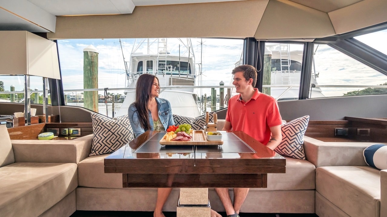 Reserve this magnificent yacht rental in Anna Maria Island, Florida. Our 63′ Prestige offers some of the best looking yacht charters in the industry. “Princess Abu II” has the space of a much larger charter yacht. She’s in immaculate condition and has a ton of entertainment space in multiple layouts. Abundant natural air and light are hallmarks of Prestige Yachts. This one has a Sea keeper to help reduce seasickness, fatigue and anxiety that some guests may experience. The well-balanced exterior design has bold, clean lines. The bright interior layout is spacious and inviting. From the expansive swim platform to the plush sun beds at the bow, every inch of this yacht rental invites you to embrace your surroundings.