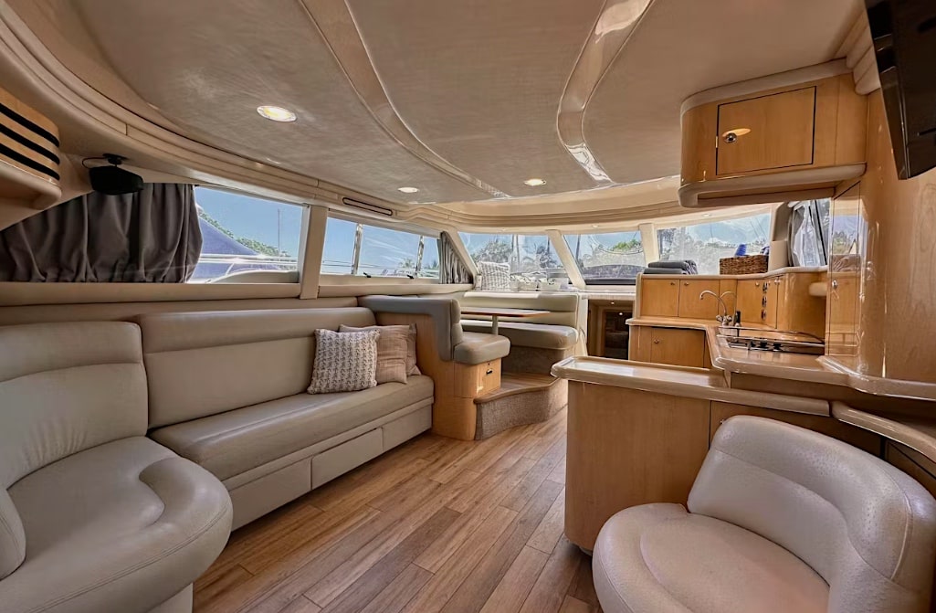 The benefit of a generator and solar giving you the option for longer trips at sea aboard this Dania Beach yacht charter. Marvel at the impressively spacious interior. This yacht for charters is a popular choice for those with larger groups of family or friends. This charter yacht is the largest yacht for rent in the fleet and an excellent pick for day trips to Bimini or week-long excursions to the Bahamas. Like a home away from home, SeaRay features a sizable cabin with plenty of seating, a galley and a dining area. The wraparound windows allow plenty of natural light in and ensure you don’t lose sight of the famous blue water surrounding the Bahamas. Join us at sea!