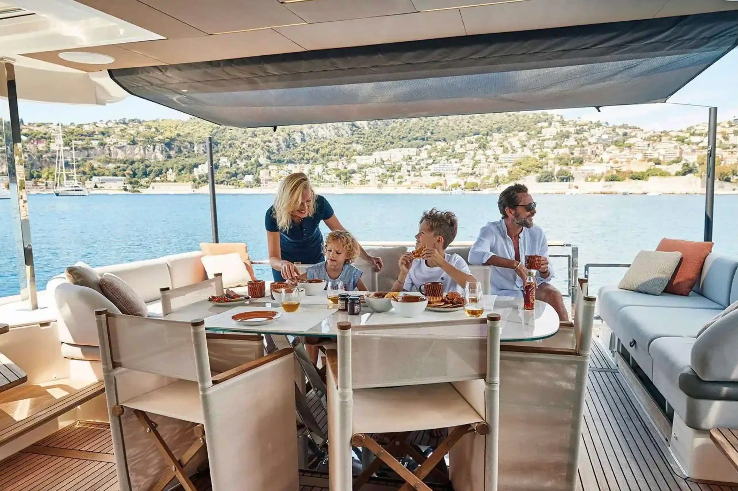 This private yacht charter features a signature Beach Club with fold-out sun lounge, direct access to the hydraulic swim platform, and a dedicated Bluetooth sound zone for easy water-level fun. The main deck aft offers shaded lounge seating, an electric grill, wet bar, ice maker, and dining space, while the expansive flybridge provides 360-degree views, multi-zone seating, another grill, and a retractable roof. Explore more elevated options through our curated Destin yacht charters, designed for guests seeking innovation, comfort, and coastal freedom.