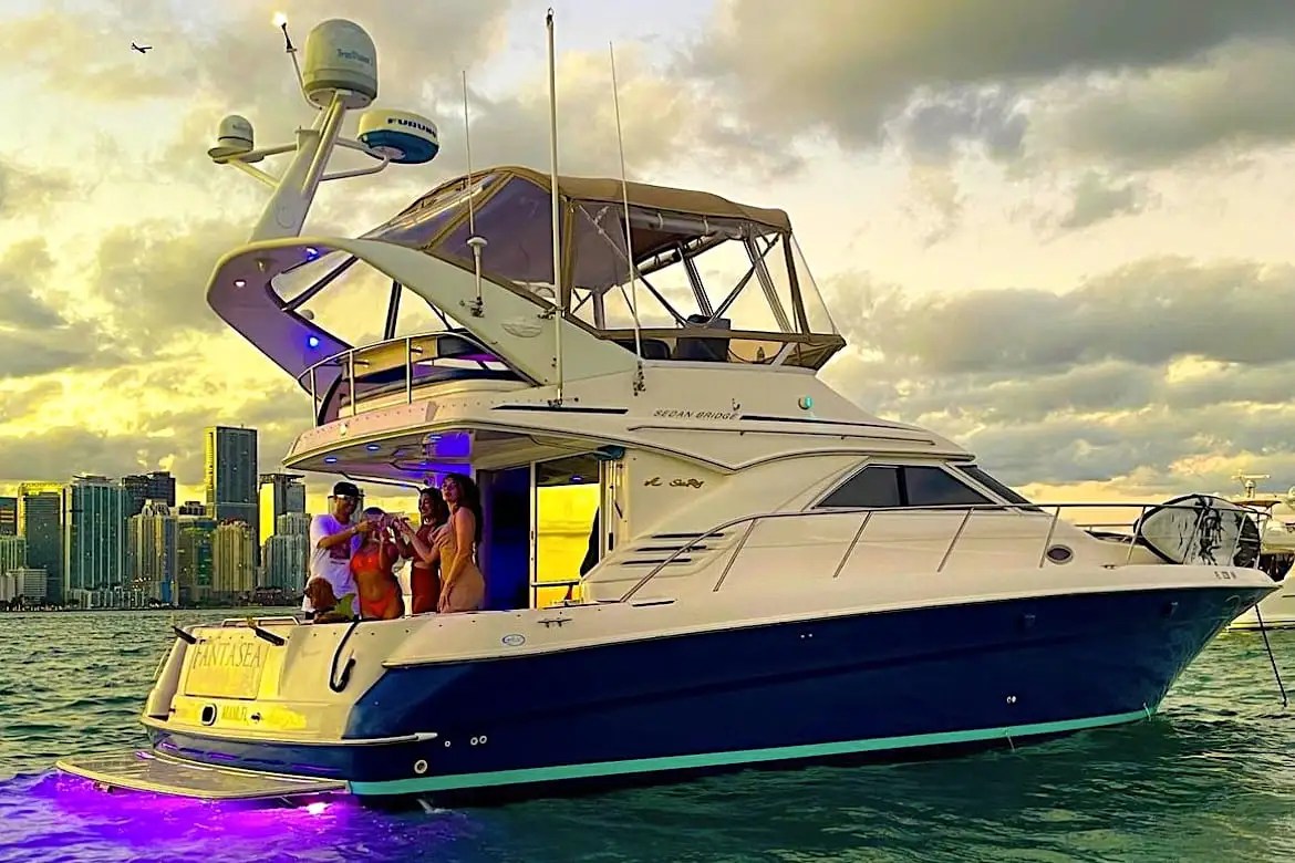 This boat rental comes with two spacious cabins and two full bathrooms. Hide out in the cabin with air conditioning to cool off from the sun. All charters include a United States Coast Guard licensed Captain. We offer a magic carpet to enjoy the sea. No need to bring your own ice. We’ll provide it for you. We also have a cooler to keep drinks cold. Your charter package comes with pre-paid fuel at 6-10 knots. Our crew of experts will ensure that your experience will be memorable. They’ll serve you while you enjoy your boat day. Welcome aboard. Your next luxury charter experience awaits you. Book online today. We offer all-inclusive prices. No hidden fees!
