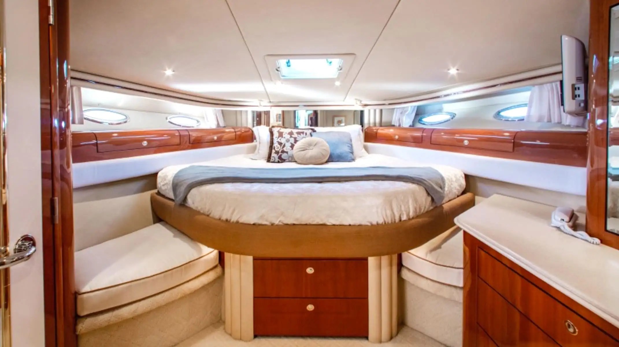 The 58′ SeaRay delivers timeless elegance paired with modern engineering. Relax on the flybridge deck with 360° views, unwind on the bow sunpads, or dine al fresco on the aft deck surrounded by coastal breezes. Inside, the saloon offers wrap-around windows, a fully equipped galley, and stylish décor. Below deck, three guest cabins with ensuite baths create a private retreat. Every detail of this SeaRay yacht rental in Fort Lauderdale blends American craftsmanship with effortless luxury. Discover more stunning yachts in our Fort Lauderdale yacht charters collection.