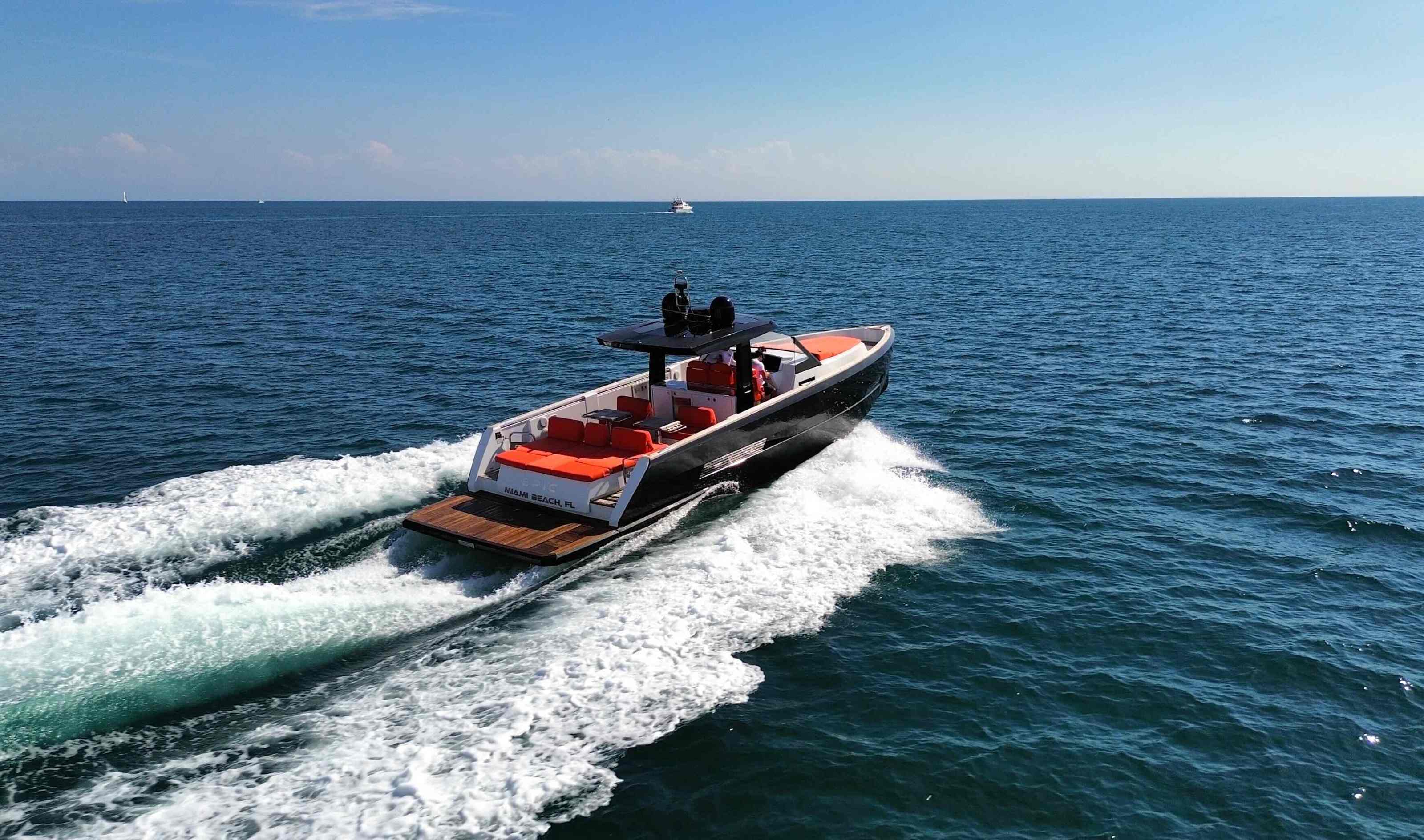 Reserve the ultimate boat rental in Fort Lauderdale, Florida. Our 42′ Fjord comfortably hosts up to 13 guests. This charter boat is a popular rental. “Epic” offers a hydraulic swim platform for easy transition into the water with automatic stairs and includes a ton of water toys for guests. With ample seating, a comfortable cabin with a full restroom and a sun shade, this boat charter in Fort Lauderdale is ideal for cruising in South Florida. The intimate space allows you to interact with friends & family inside, at the front, on the fly bridge or in the back. Enjoy the sun or stay in the shade. She has a comfortable cabin with a full restroom. This boat charter in Fort Lauderdale can cruise to Miami and Palm Beach. We can pick you up anywhere in South Florida for an extra fee.