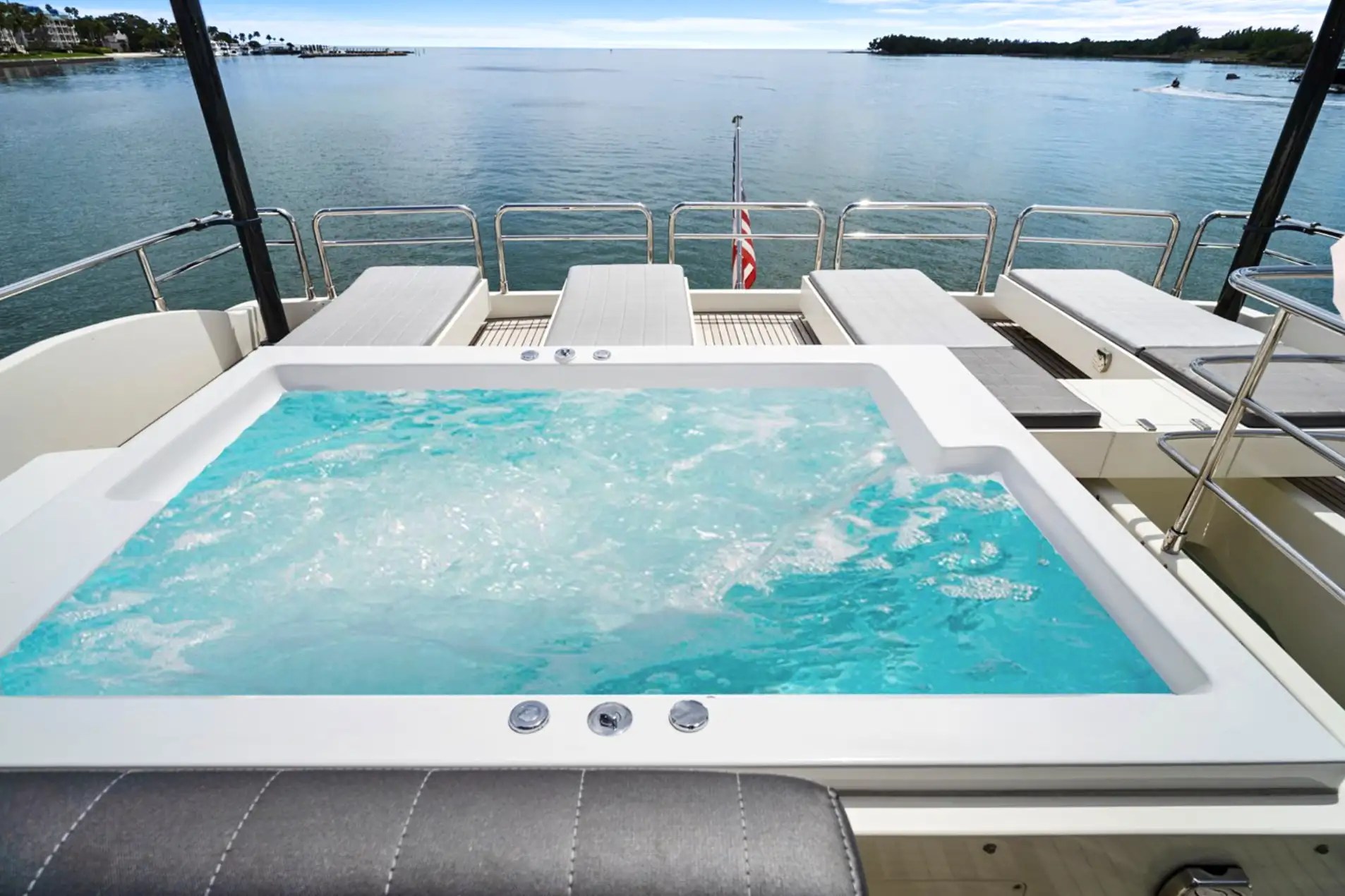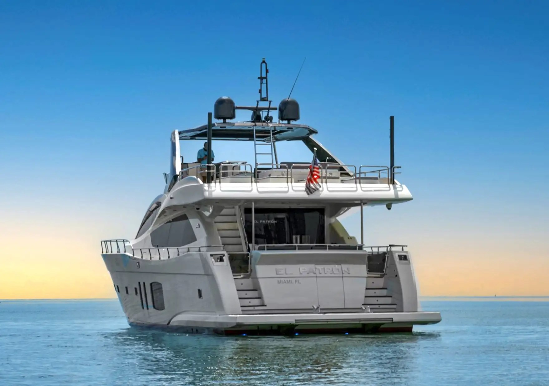 This yacht for rent in Fort Lauderdale is designed to perfectly blend indoor and outdoor living. Outdoor spaces include a large aft sitting and dining area that comfortably seats eight. The expansive flybridge includes beautiful forward sun pads, a wet bar with sink and grill and 4 sun lounges. Perhaps the best feature aboard this luxury yacht charter is the top-deck jacuzzi. She also features an impressive sound system. El Patron is maintained by a full time captain and crew. This Fort Lauderdale yacht rental is available for day charters and term charters with boarding at Sunrise Harbor Marina. Rent this yacht charter for any type of party. Splurge a little. You only live once!