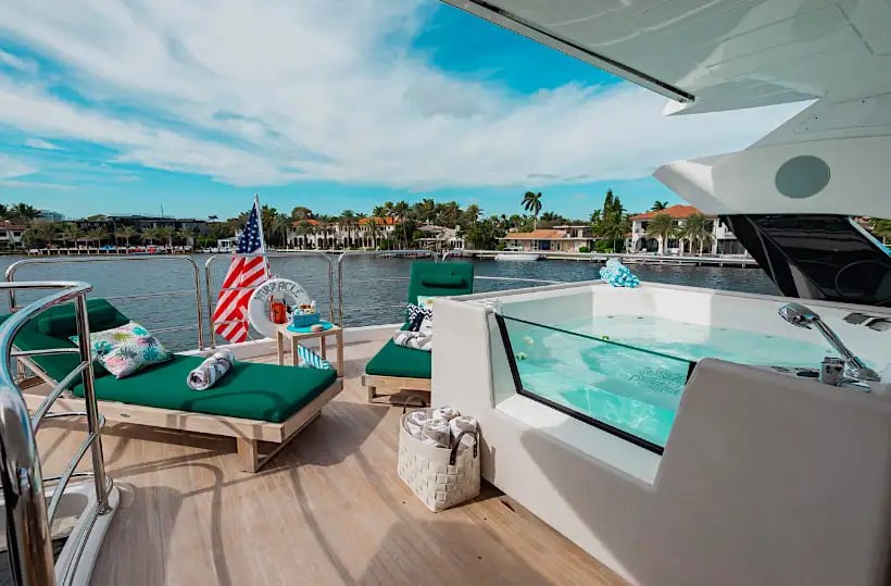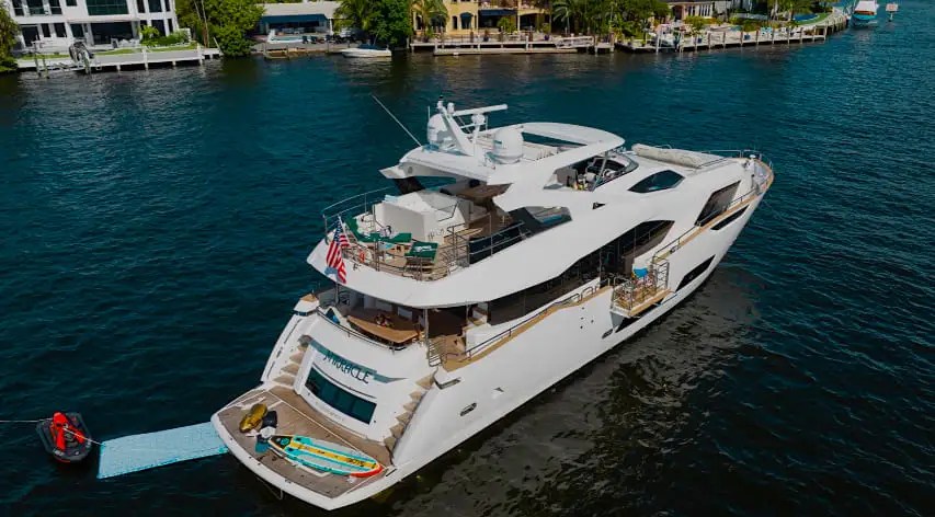 Book a yacht rental at Sunrise Harbor Marina in Fort Lauderdale. Our 95′ SunSeeker is available for charters around Florida & The Bahamas. This luxurious 2023 model is the epitome of luxury and elegance on the open sea. Enjoy the beautiful views from just about anywhere aboard “Mirracle.”She was built with an interior configuration designed to comfortably accommodate up to eight overnight guests in four staterooms. This yacht rental also comes with an on-deck captain including a split-level ensuite bathroom, one spacious queen-size VIP stateroom, as well as 2 twin/queen convertible cabins. The versatile design makes it the perfect boat for couples or families.