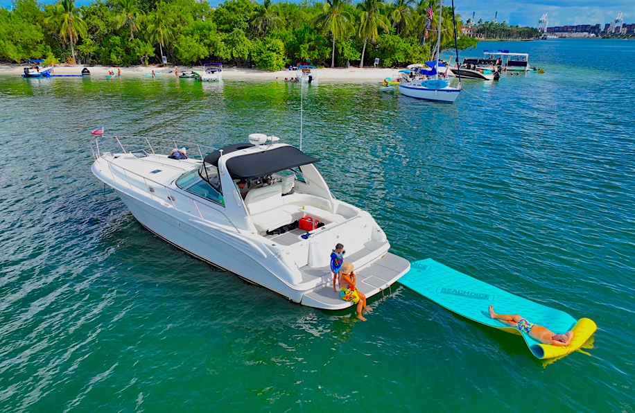 Reserve this fantastic boat rental in Hollywood, Florida. Our 45′ SeaRay is very functional for charters involving couples or families. “Dream I” is an ideal charter boat for relaxing in the sun, island hopping, discovering beautiful islands or celebrating a special event in your life. This Miami boat for rent offers a minimum 2-hour half-day or 6-hour full-day charter. Boarding is at the Isla del Mar Condominium in Miami. She is equipped with custom lighting, bluetooth entertainment throughout the rental boat as well as TV’s for your entertainment. This boat charter in Miami is in great condition and it has what many SeaRay owners believe is the better 2 stateroom layout. Powered by twin Cummins Diesels, while enjoying the easy access from Bridge to Bow area via molded step access.
