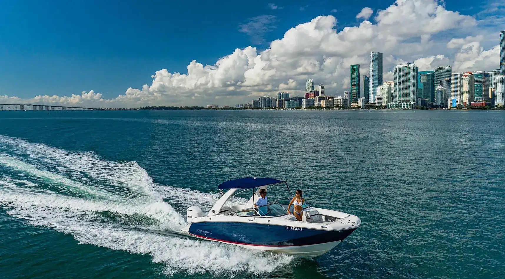 This 27′ Regal OBX offers a modern open deck design that’s perfect for socializing—plenty of seating, a swim platform for quick dips and a high-quality Bluetooth sound system that brings your favorite tunes to life. Whether you’re chilling on the bow, lounging in the cockpit or diving into turquoise water, the layout keeps everything connected and fun. From a floating lounge to a sandbar stop, this boat fits the energy. Explore our curated collection of Miami Beach boat rentals and see why this class of boat continues to lead for groups seeking versatility, performance and style.