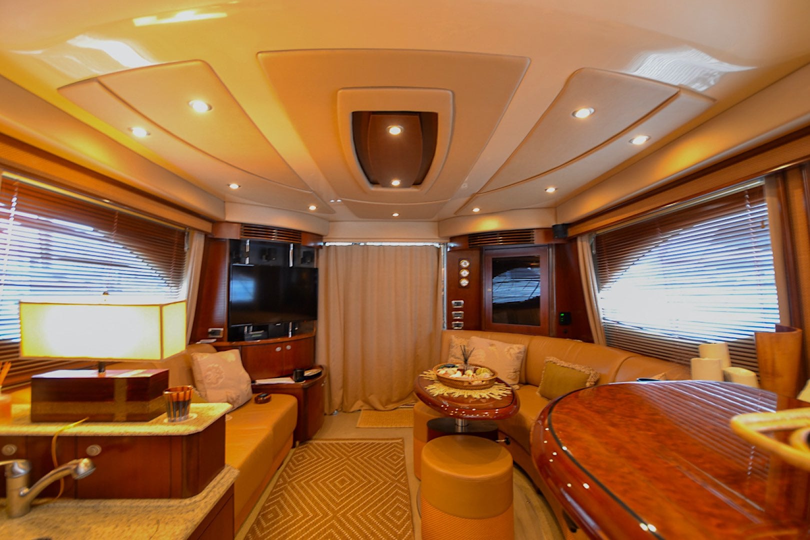Up to 13 guests can cruise Biscayne Bay aboard this Miami Beach yacht rental. She can also accommodate up to six guests in two staterooms for overnight charters. More powerful and adventurous than any other yacht in its class, the 580 Sedan Bridge is ready to take command of the water. Its bold, dynamic styling includes a fiberglass hardtop as well as the very latest in marine electronics. Once at anchor, you’ll be able take a refreshing dip in our tropical waters or float around on our giant LilyPad. For water toys, she includes an inflatable pool, magic carpet & noodles. Want to catch some rays? Head to the bow and bask in the sun on our sun pads. Don’t miss your next yacht charter in Miami Beach.