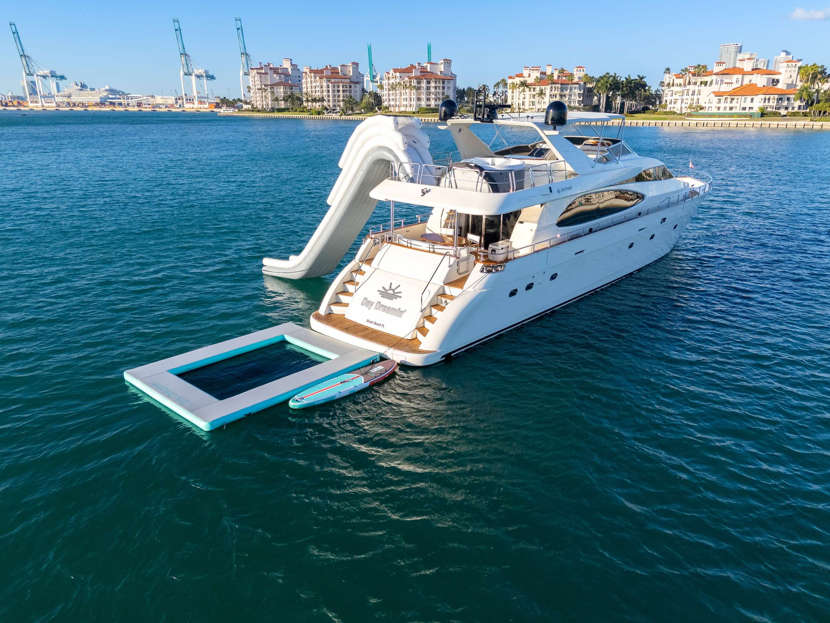 Reserve this amazing yacht rental at Miami Beach Marina in Miami Beach, Florida. Our 90′ Azimut was designed for smooth, harmonious cruising during yacht charters in Biscayne Bay and beyond. “Day Dreamin” is made for unforgettable charters, whether you’re throwing an epic celebration, enjoying a luxe family getaway or simply living it up under the Miami sun. With its iconic Italian design and spacious layout, every inch of this rental yacht screams high-end comfort and cool sophistication. Inside, you’ll find sleek interiors, plush lounging areas and a fully-equipped kitchen for all your snacking or gourmet needs. Outside, the fun never stops. From soaking in the on-deck Jacuzzi to catching rays on the magic carpet or gliding across the water on a paddle board, your next luxury yachting experience will be unforgettable.