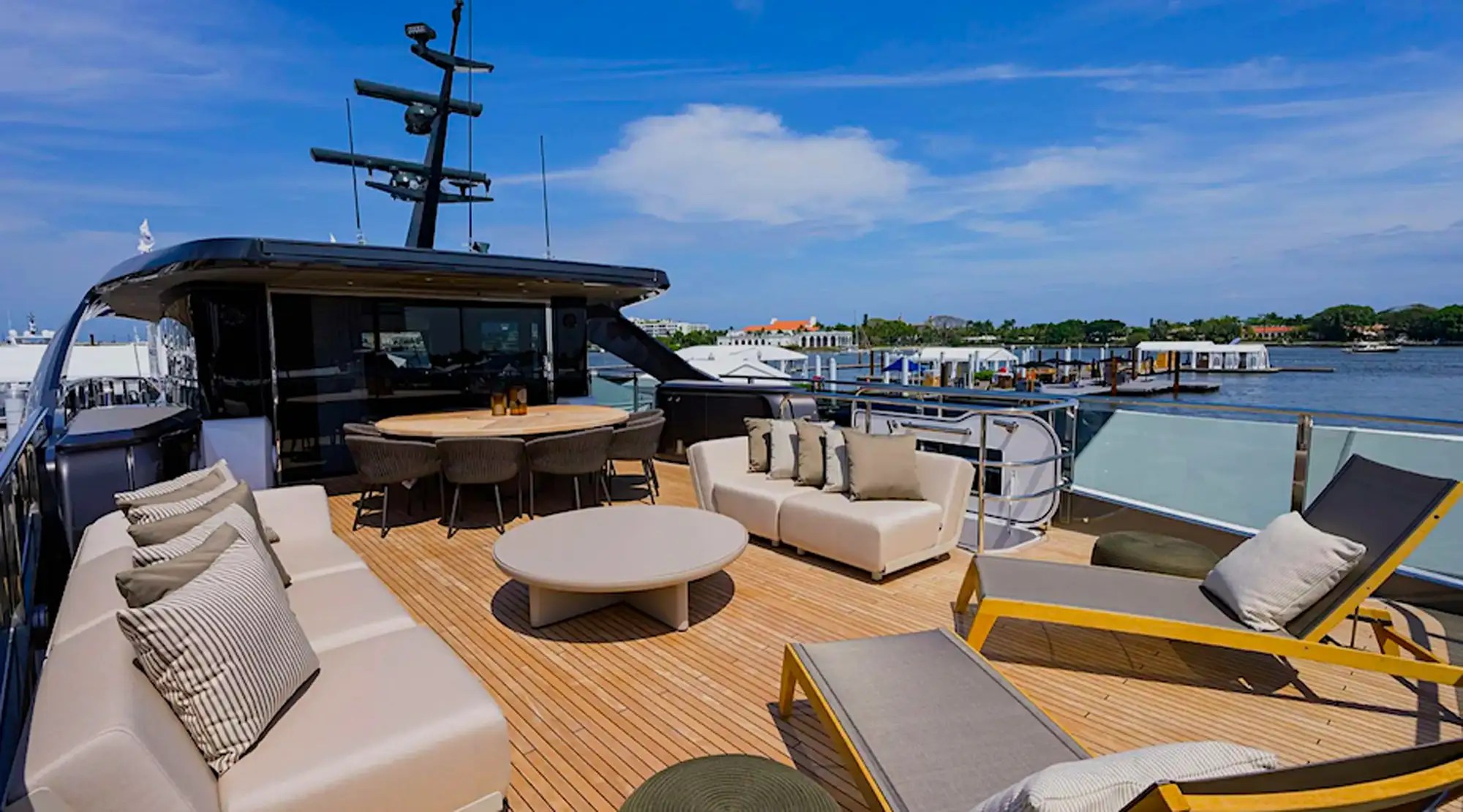 Book this magnificent yacht rental at Epic Marina in Miami, Florida. Our 100′ Princess is actively available for charter in several cruising destinations. “Monopoly” was built and delivered to her owner in 2023. She’s been designed to comfortably accommodate up to 10 charter guests in 5 staterooms. The guest cabins comprise a primary suite with a king size bed, 2 cabins with a queen size bed and 2 cabins with a double bed. Your luxury yacht charter in Miami, aboard this yacht rental, will be managed by a crew of three including the captain. Our crew will ensure you have a relaxed and enjoyable charter experience with all of your needs met quickly and efficiently. The crew have separate crew quarters allowing guests to enjoy increased levels of privacy.