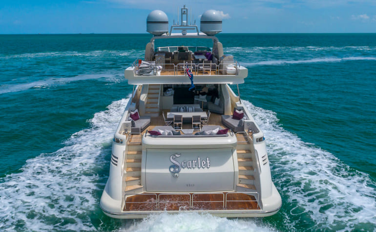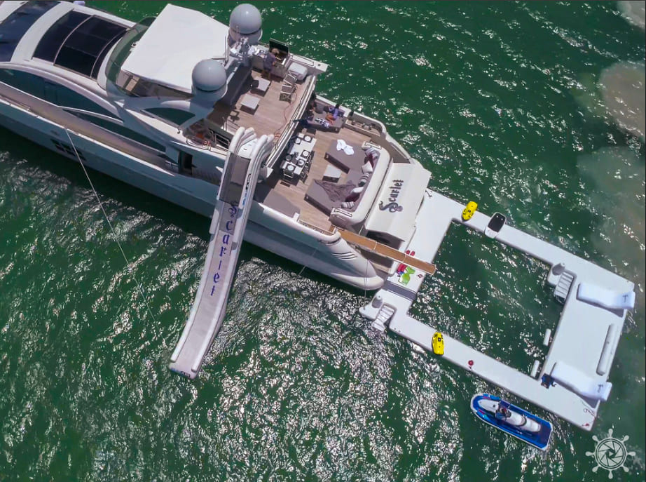 Take a look at one of the largest, most luxurious and finest yacht rental boarding along the river in Miami, Florida. Cruise Biscayne Bay in style aboard our 103′ Azimut! “Scarlett II” has it all. This charter yacht completed a million-dollar refit in 2019. Her expansive aft deck is sure to impress at social gatherings. The flybridge and bow of this yacht for charters offers unique living areas that accommodate large groups. This luxury yacht rental is also equipped with some phenomenal water toys, including a giant water slide on the top deck, an inflatable pool, 2 jet skis, 2 SeaBobs, 2 paddle boards, a magic carpet with jousting poles, and a towable tube + FlyBoard, Lift Foil, and a wakeboard.