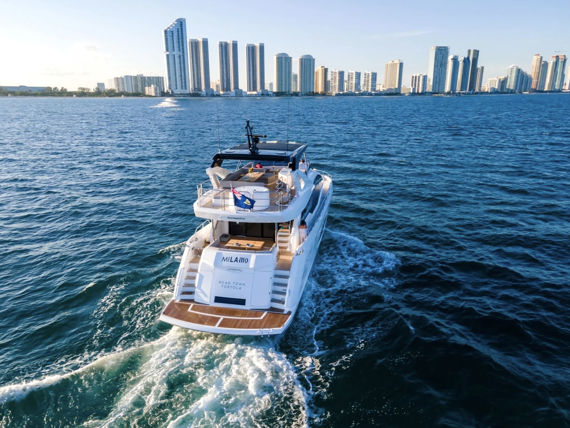 Book this modern yacht rental at Bay Street Marina in Nassau, Florida. Our 76′ SunSeeker is a wonderful choice for your next vacation. This is a prestigious yacht for charters that includes a Jacuzzi. “Milamo” spends the summer and winter seasons in the Bahamas. She was built by SunSeeker in 2022. The well-planned layout of the yacht features four generous cabins that can easily accommodates a group of eight overnight guests. Not only does this model cut an impressive silhouette on the horizon, but an expanse of glass and sunlight also welcomes you onboard. The main deck allows you to entertain with an almost 360-degree view of your surroundings. For ‘al fresco’ life, this flybridge yacht provides unprecedented levels of space and flexibility.