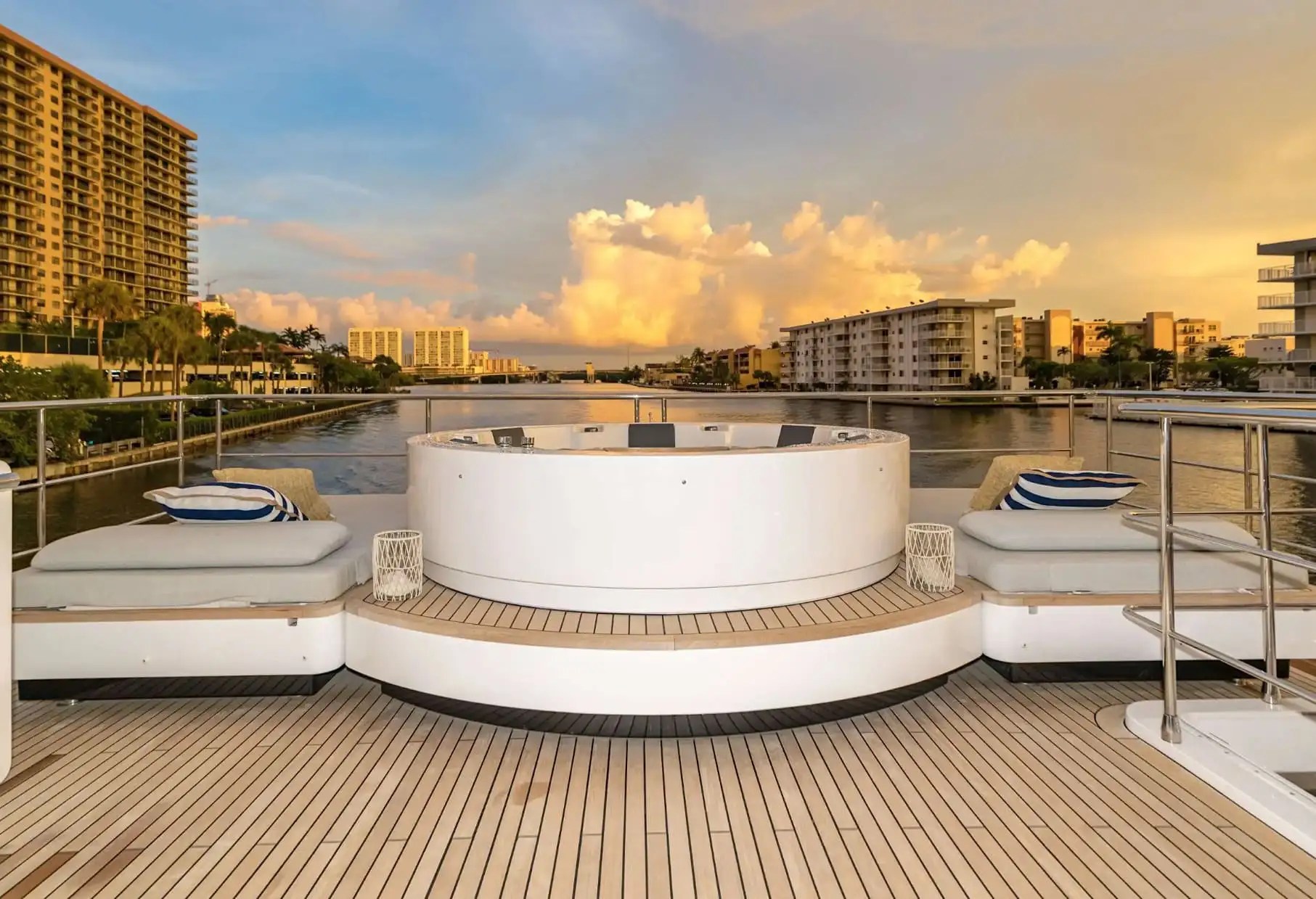 The 88′ Azimut is a masterpiece of craftsmanship and innovation. Enjoy expansive flybridge seating, a Jacuzzi with ocean views, and shaded lounges perfect for sunbathing or socializing. Inside, the yacht offers a spacious saloon with panoramic windows, a formal dining area, and four guest staterooms each with private ensuite bathrooms. State-of-the-art entertainment systems and elegant décor ensure a five-star experience. Whether you’re hosting a celebration or unwinding with loved ones, this Nassau yacht charter delivers sophistication and serenity. For more luxury options, explore our collection of Nassau yacht charters.