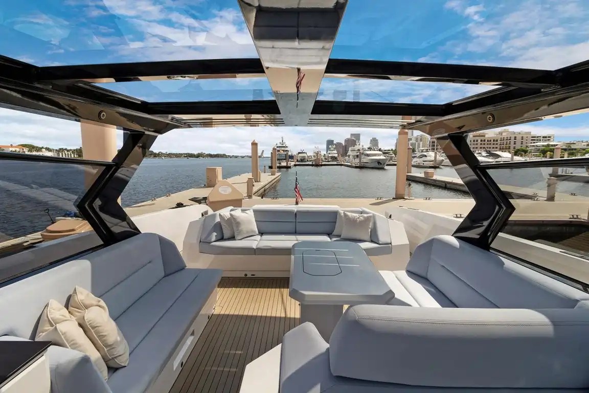This private yacht rental in Palm Beach blends high-performance cruising with resort-level leisure, powered by twin Volvo IPS 950 engines for exhilarating speeds up to 40 knots. Relax across oversized sunpads, spacious cockpit seating, and stylish social areas designed for connection and celebration. Inside, the convertible lounge and master stateroom offer beautifully curated comfort after sun-soaked adventures. For more world-class luxury charters, explore our curated selection of Palm Beach yacht rentals crafted for unforgettable on-the-water experiences.