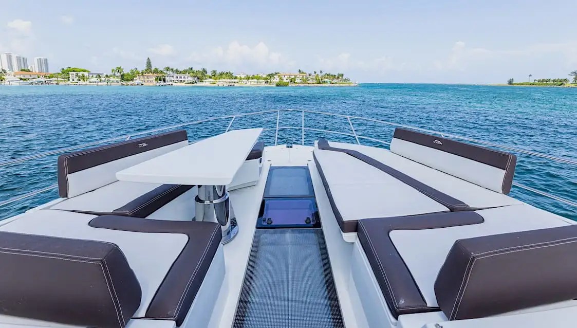 The 64′ Galeon offers remarkable innovation with its signature beach mode terraces and open, light-filled design. Lounge on the flybridge deck for panoramic views, relax on the bow sun loungers, or dine al fresco on the aft deck surrounded by sea breezes. Inside, the saloon features floor-to-ceiling windows, a fully equipped galley, and contemporary furnishings. Below deck, four guest cabins with ensuite bathrooms provide elegant comfort. Every inch of this Galeon yacht rental in Palm Beach is designed for beauty, functionality, and relaxation. Explore more luxury options in our lineup of Palm Beach yacht charters.