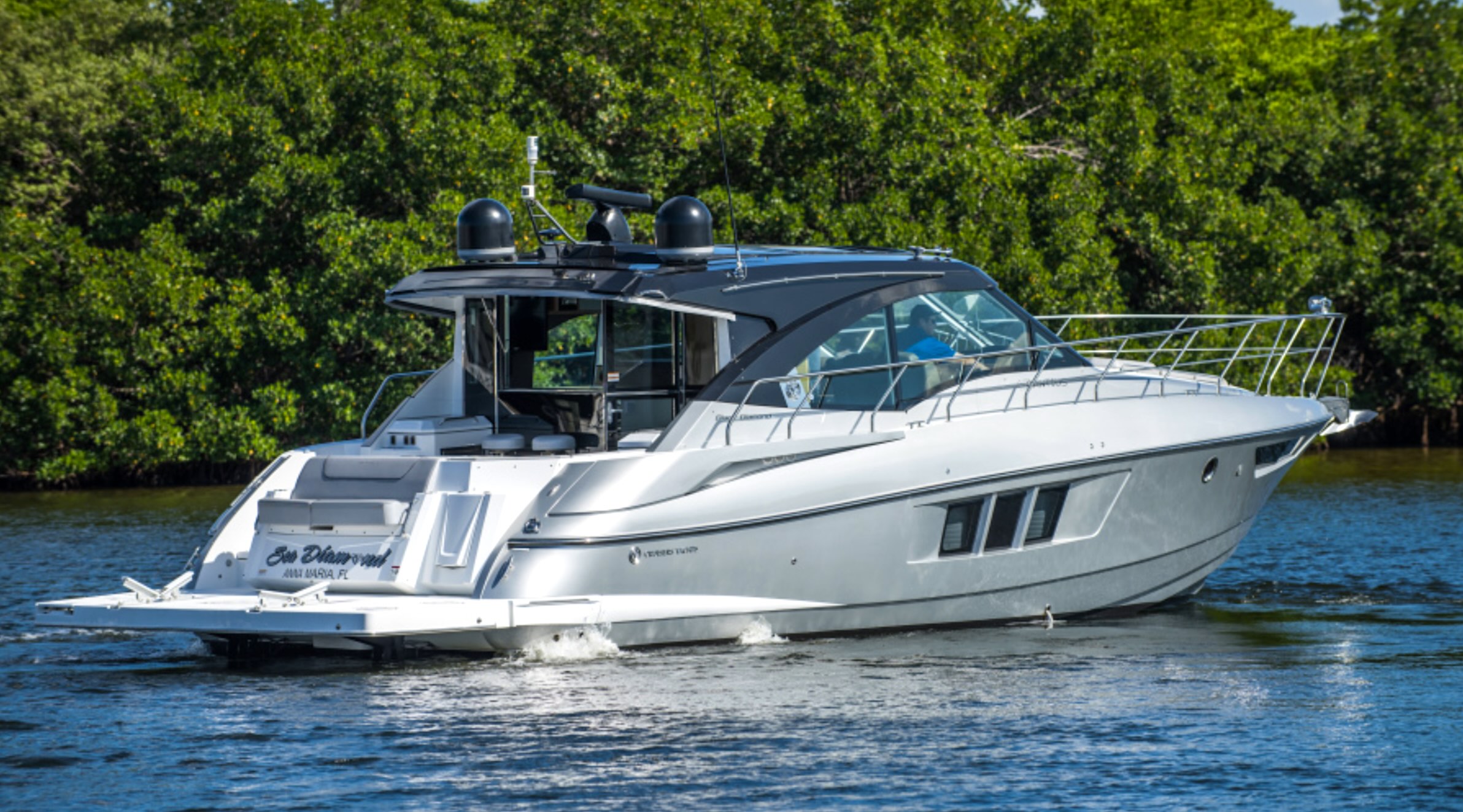 Reserve this modern boat rental at Nora Patterson Bay Island Park in Sarasota, Florida. Our 48′ Cruisers is a wildly popular for day charters. This charter combines modern styling with an innovative dual-salon layout in a boat of uncommon versatility and comfort. “Still Playing” was built for comfort and relaxation. By far the most notable feature of this boat is its “loft” layout, where the helm deck overlooks the lower level salon and galley. The area forward of the helm is open, giving the galley a cathedral effect that brings sun and air down below. The upper salon is fully equipped for entertaining with an entertainment center and wet bar to starboard and a U-shaped sofa with fixed table to port.