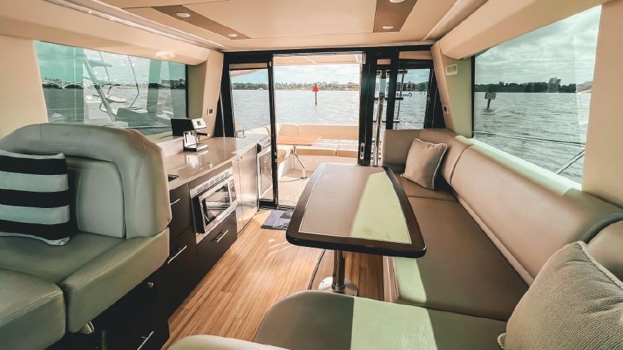 She has a two-stateroom layout with either one or two heads, which makes her appropriate for a small family or two cruising couples. Her interior makes good use of space. Her joystick functionality makes her a natural step up for owners of smaller boats and one that’s easy to handle. Boasting a spacious flybridge, open air atrium, and the most innovative luxury in nearly 50 years of boating excellence, the “Chilin” is truly in a class of its own. Whether you are looking for a fun day on the water or the ultimate memory making machine for a trip to uncharted territory, the 42 Fly has you covered. Enjoy our 2 included Sublue sea scooters, large lily pad, paddle board, and hydraulic swim platform for your convenience!