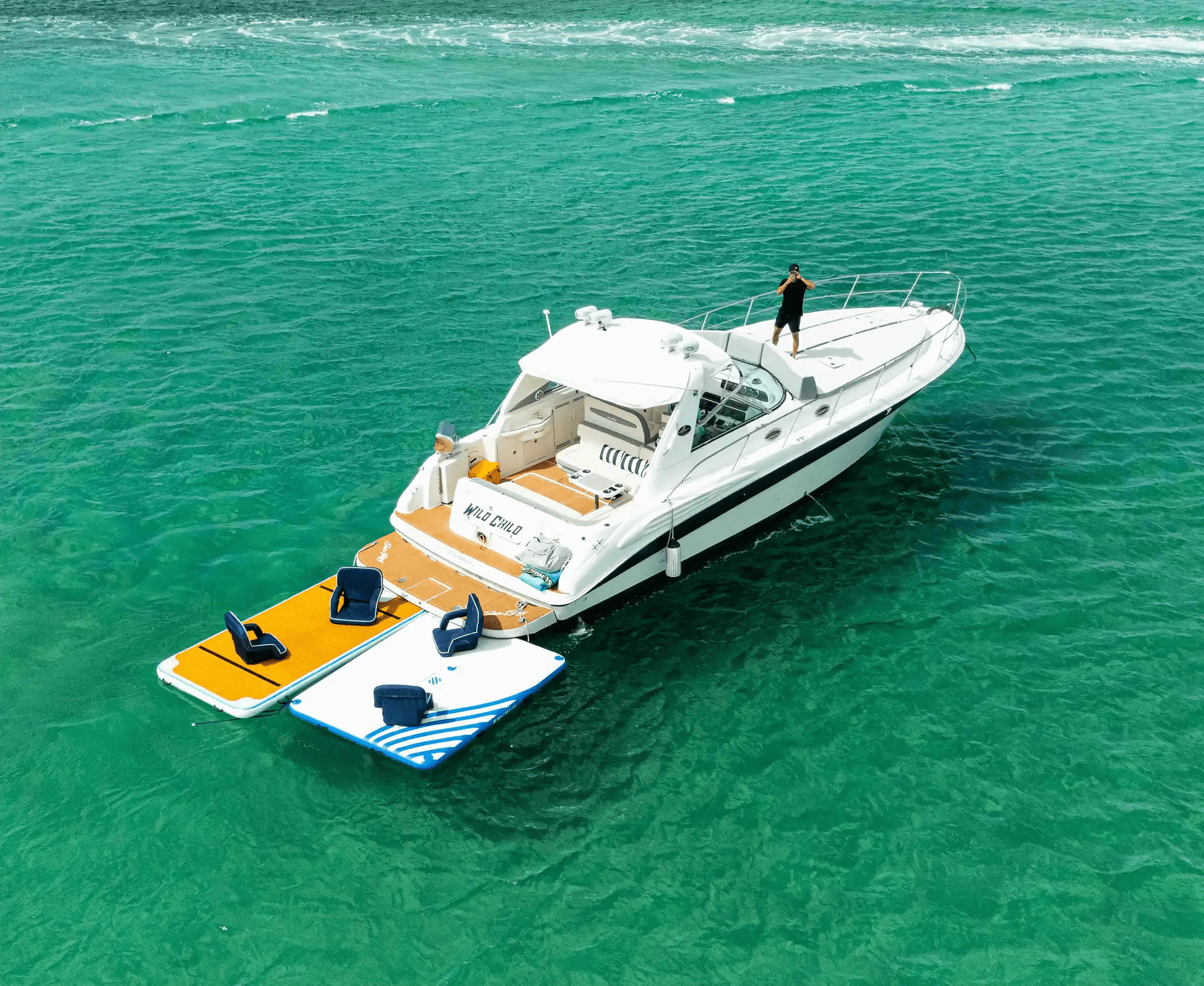 This boat rental in Sunny Isles accommodates up to 13 guests. She’s the perfect choice for couples’ getaways, getaways with friends, or intimate celebrations. On deck, you’ll enjoy spacious areas for sunbathing, sharing a drink, or simply gazing at the crystal-clear waters of South Florida. Wild Child has been designed to offer a premium charter experience, combining style, comfort and high performance in every detail. Make your next yacht trip a unique experience. Book your adventure at sea with a SeaRay today! We offer All-Inclusive Prices. No Hidden Fees!