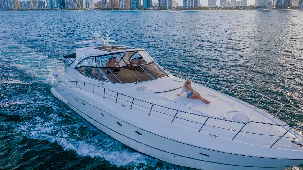 Charter this stylish yacht rental in Sunny Isles, Florida. Our 60′ Cruisers is the perfect yacht charter for those who appreciate both performance and aesthetics. “Good to be Me” offers a spacious deck area with plenty of room for entertaining guests or enjoying a relaxing charters on the water. This rental yacht for charters has a spacious cockpit that’s perfect for entertaining with ample seating and a wet bar. The cockpit of our rental yacht features a large glass ceiling, a retractable sun pad and an aft seat on the swim platform. The custom sea lift swim platform features integrated davit mounts that fold and store flat, ideal for easy access to the water and convenient storage of a tender or JetSki.