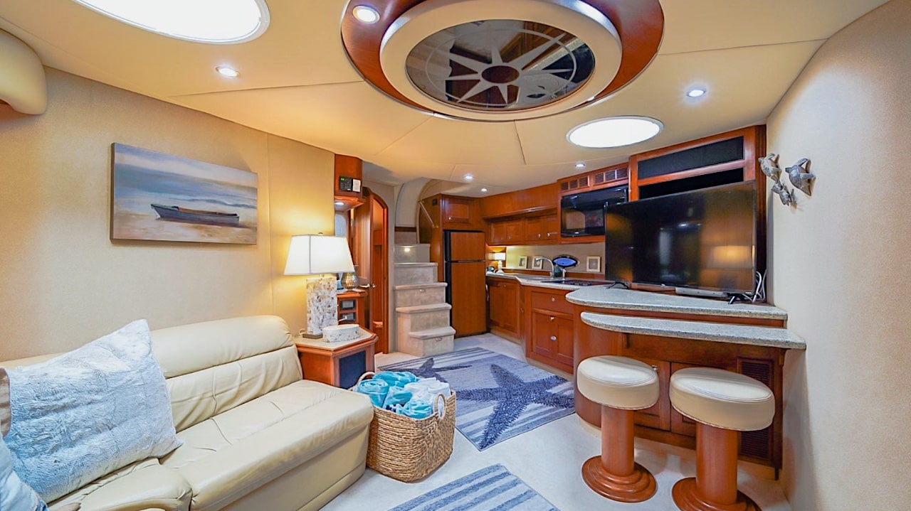 Step inside to experience the luxurious and well-appointed interior of this Sunny Isles yacht charter. The open and airy layout is designed to provide maximum comfort and convenience. The salon features a plush U-shaped sofa that can seat 8 comfortably and convert to a sleeper. You’ll also encounter cherry wood cabinetry, a flat-screen TV, two recliners and a unique table for six that lowers into the floor to create a large open space. The couch slides out to provide a larger sleeping space, making it versatile for both relaxation and entertaining. The galley is fully-equipped with modern appliances, including a refrigerator, freezer, microwave, cooktop and a dishwasher. Welcome aboard this extremely well-maintained vessel.